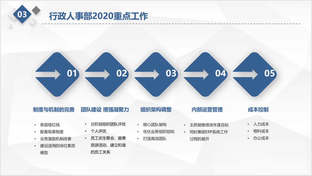 有个学员是一家公司行政人事部经理,每一年都负责行政人事制度制定、组织架构调整、团队建设、内部运营等等事宜,做的工作特别多而且杂~所以她每一年的年终总结PPT都要写30页以上,恨不得把所有做过的事全部都罗列一遍,下面是她的年终总结目录~这页PPT的标题是“重点工作”,既然是“重点”,那就应该就一两个才对,而她列了5个,并且每一条下面还有三四条分类~如果你是老板,你每一年都看到这样的PPT,你会怎么想?可能会跟我感觉一样,“这个员工只有苦劳,看不到她的功劳,更看不到她每一年的变化!”然后她就跟我急了,“不行啊,三爷,我这一年做了这么多工作,我不告诉老板的话岂不是吃亏了!”我说:“让老板看到一个不会抓重点的管理者,你会更吃亏!”后来,我引导她不断自我提问:“今年公司的目标是什么?老板关注什么?我做的哪一项工作直接或者间接地给公司创造了比较大的价值?”最终,她只挑了一个工作模块——“成本控制”来深度阐述,并且将整个PPT压缩到了15页,封面标题是“节流也是一种开源”。如果你的工作内容也是像她一样又多又杂,而且每一年都差不多,那么三爷建议你:2)挑选重点的标准是:为公司创造了价值,或者是老板关注点,或者符合公司战略方向