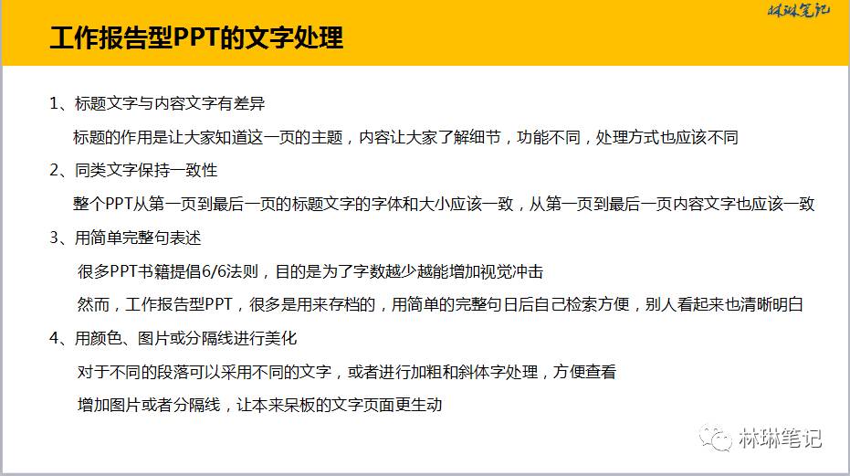 文字处理是PPT的第一门功课,很多朋友都认为文字是PPT的“天敌“,特别是工作报告型的PPT。怎么写文字才不显单调?放多少文字才能即看得懂又不觉累赘?
