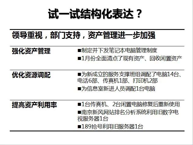 比如下图的PPT,看起来工整规范,数据一目了然,现在问题来了,这些数据说明什么问题呢?