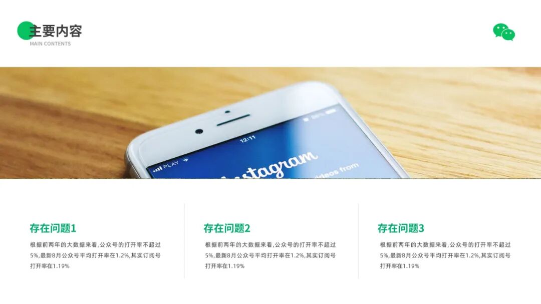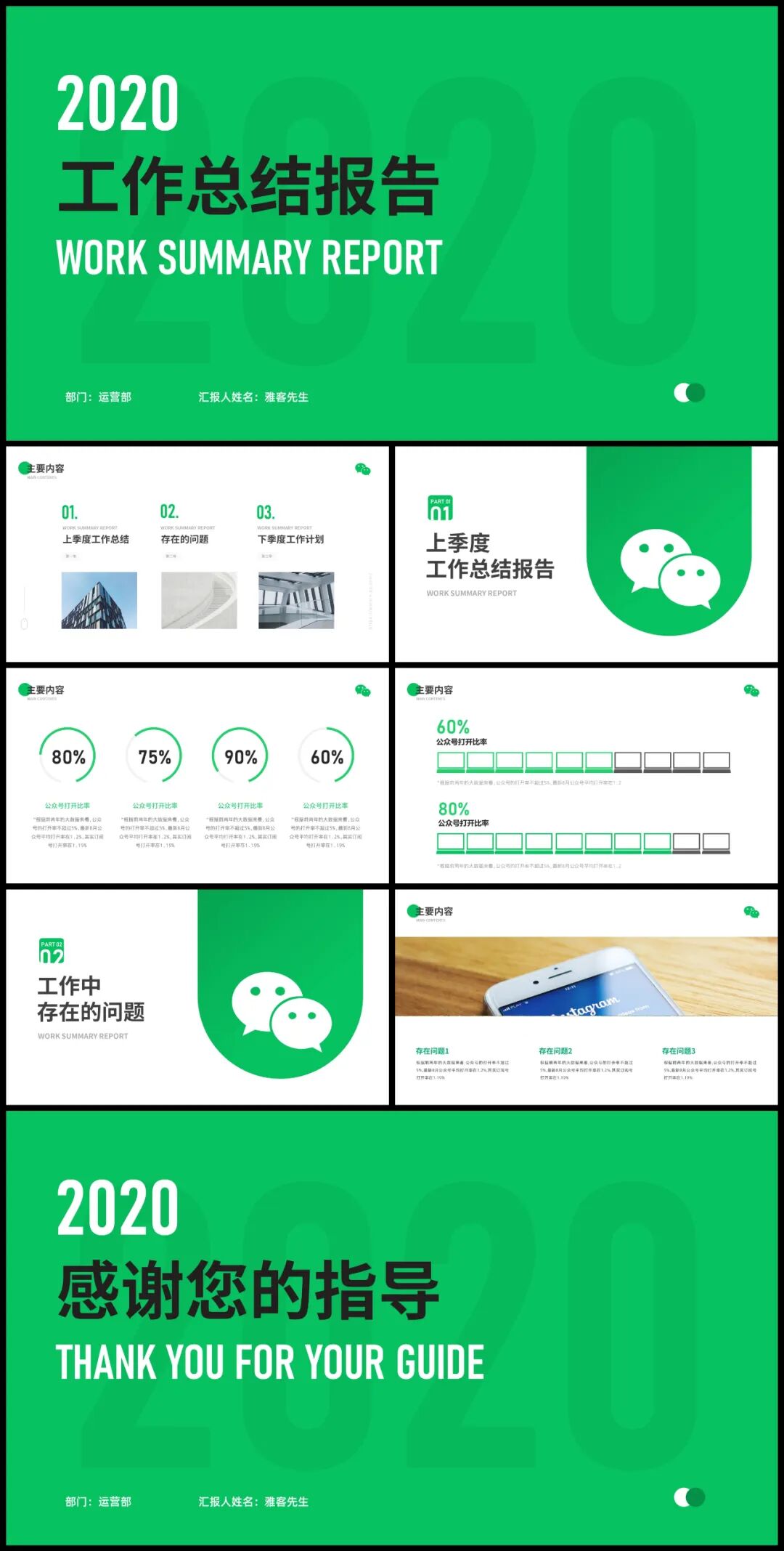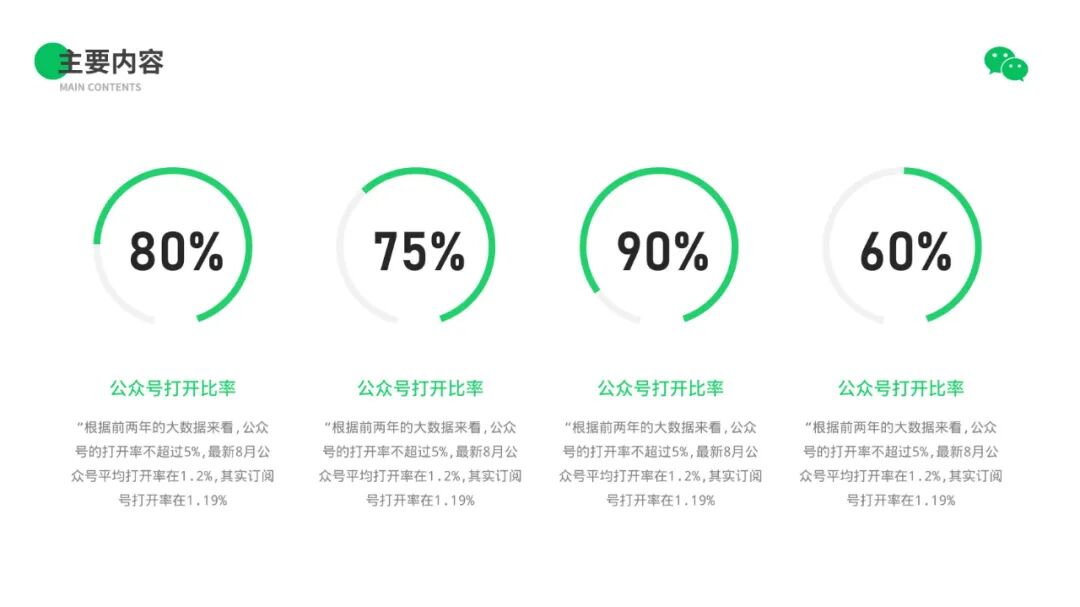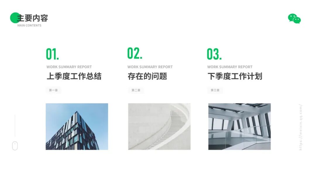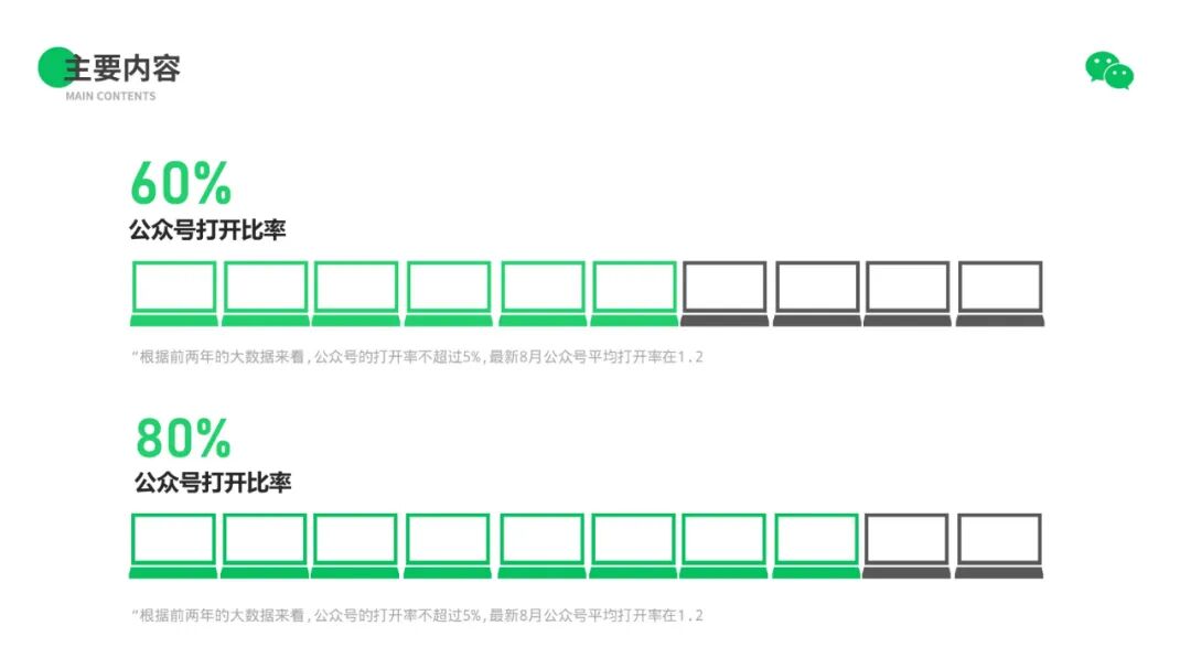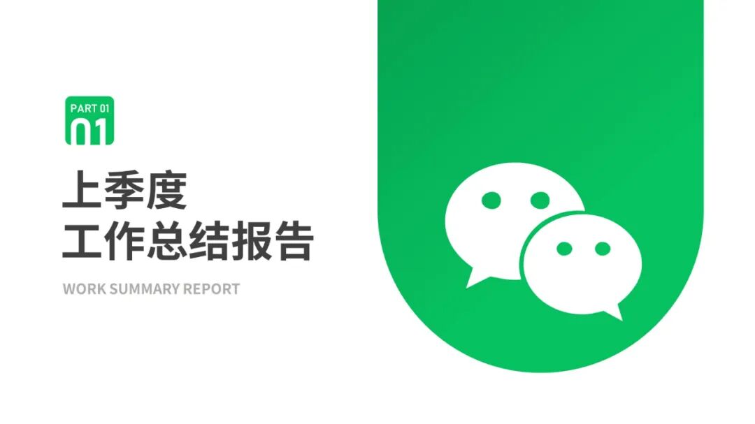 大家可以看到,整套作品我们其实都是沿用了微信的绿色来设计的,而且整体风格比较简约,也贴合商务风的属性。