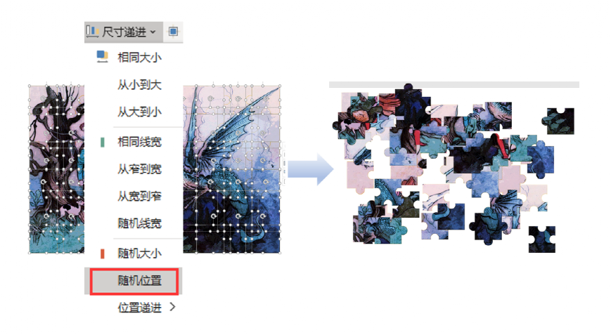 3.全选所有拼图卡片,点击【OneKey 10】——【尺寸递进】——【随机位置】将拼图卡片打乱,接下来就可以开始游戏了!