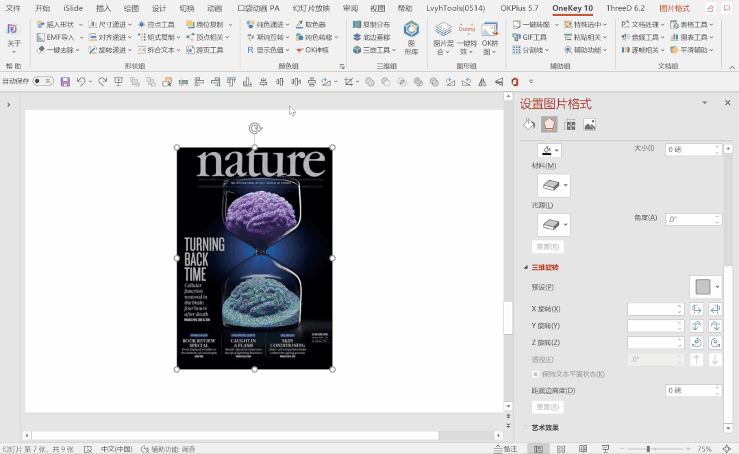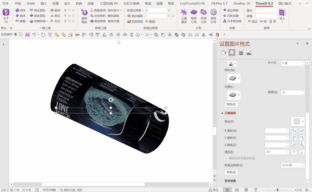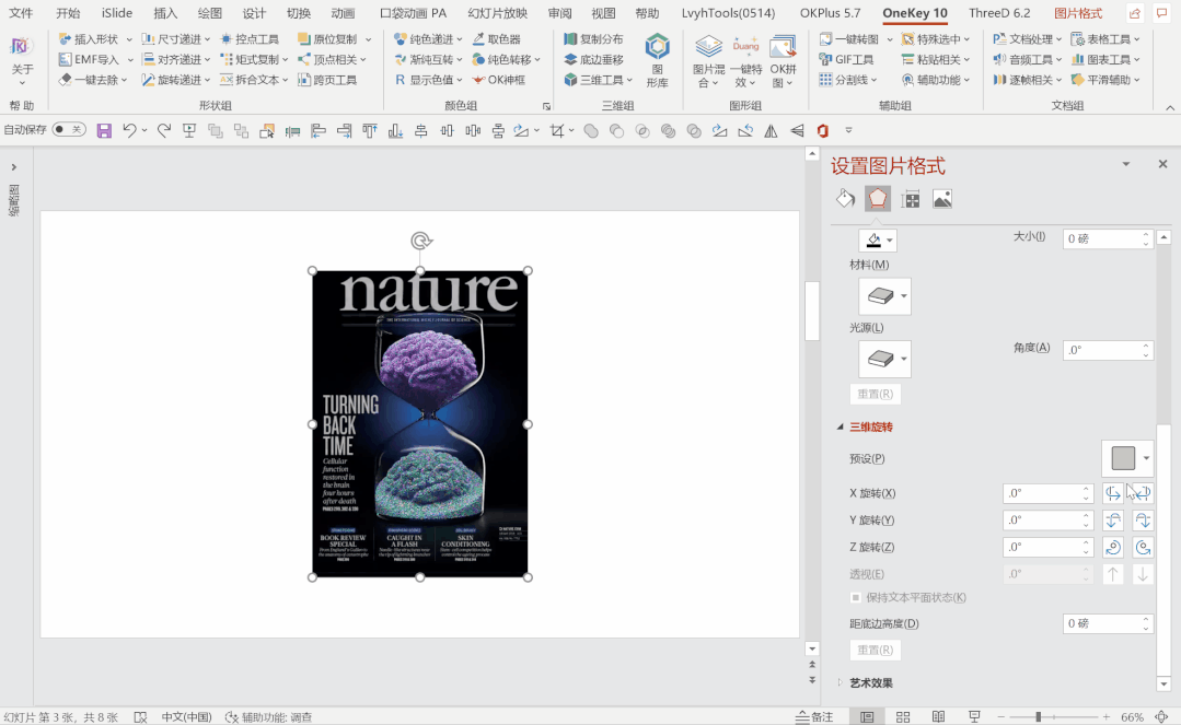 1.在PPT中选中图片,对图片进行三维旋转到恰当角度