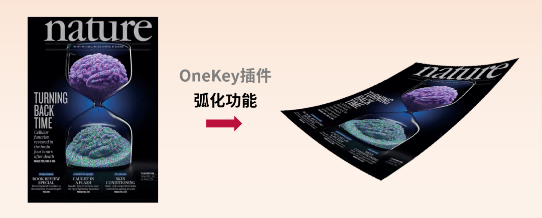 使用OneKey插件的图片倾斜/弧化功能,可以快速制作图片的3D弯曲效果: