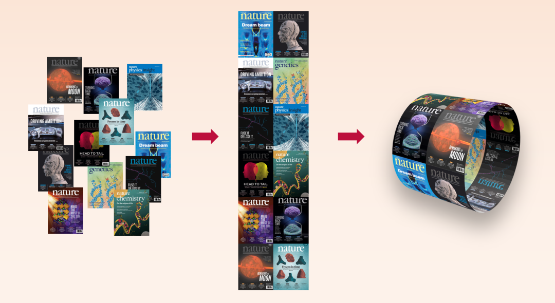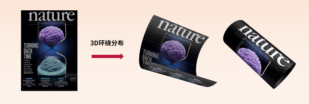 使用OneKey的“复制分布”或者ThreeD插件的"环绕分布"功能,可制作大角度的3D弯曲效果,甚至弯曲成圆筒: