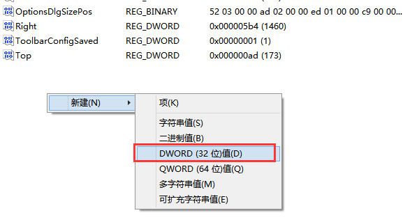 在右侧空白处右击鼠标,选择“新建”下面的“DWORD (32位)值(D)”,便会自动创建一个文件。