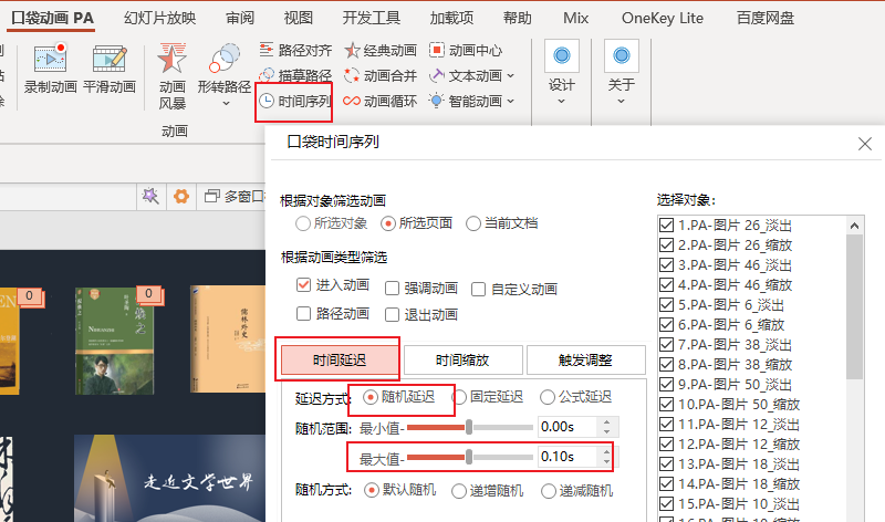 再插播一个小知识点:这里随机调整动画的延迟时间,你可以通过手动一个一个调整设置不同的延迟时间,也可以选中全部动画后,利用口袋动画的【时间序列】,设置时间延迟为随机延迟,设置最大值为0.1s。这样就可以随机让这些动画效果产生不同的延迟时间。