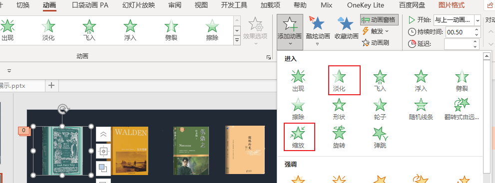 选择页面中的第一张小图片,依次添加上“淡化”和“缩放”两个进入效果