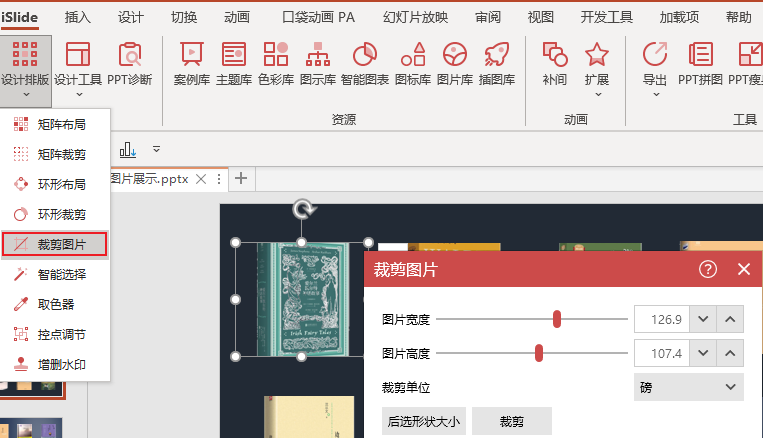 这里给大家插播一个小知识点,多张图片可以一次性全部裁剪为一样大小。方法就是全选所有图片,然后利用islide插件的【设计排版】-【裁剪图片】,设置图片宽度和高度后,就可以一次性把所有图片裁剪为一样大小。