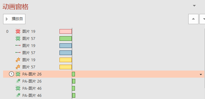 添加上所有的动画之后,可以在动画窗格里,随机调整下动画的延迟时间,让他们产生交错进入的效果。