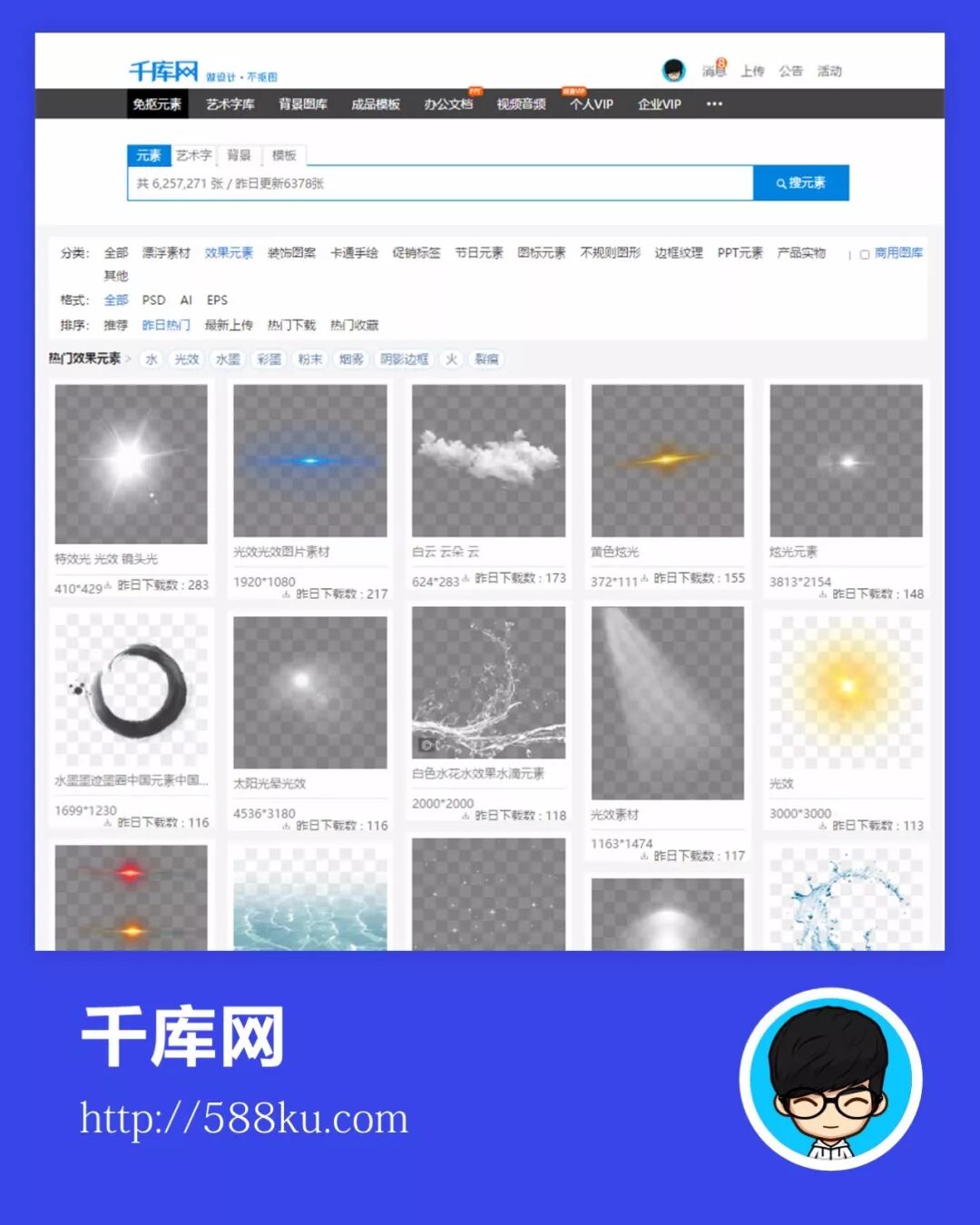 千库网除了扁平化素材,还有光效、科技线条和很多常用的修饰素材,比 PNGIMG有更强的适用性。