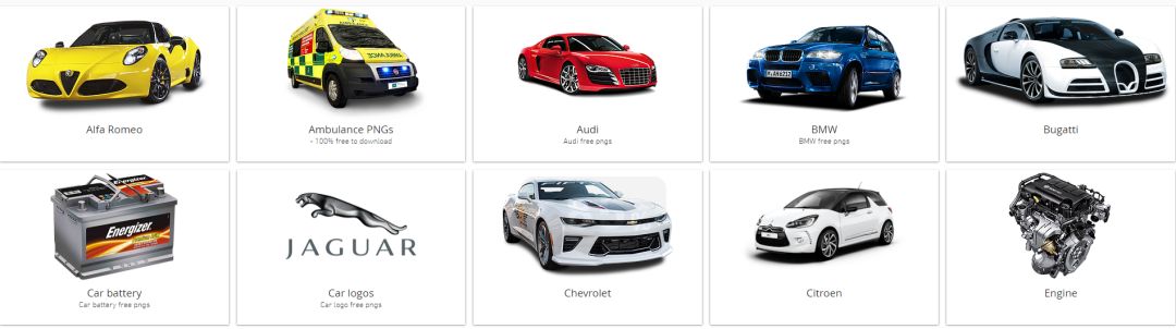 比如需要做一份汽车相关的 PPT,你可以通过交通工具的类别,找到类似这样的图片(部分):
