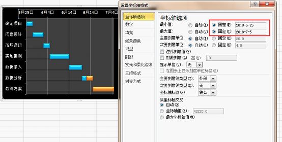 在坐标轴选项中,设置最小值和最大值为固定方式,最小值输入项目的开始日期,最大值输入项目的结束日期: