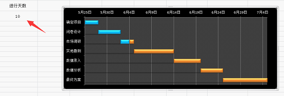 在实际应用中,使用控件来控制甘特图的意义并不大,更为合理的用法是使用公式=TODAY()-B3来计算进行天数(A12)。这样做的好处是每天打开表格看到的都是截止到当天的进度。