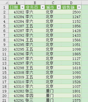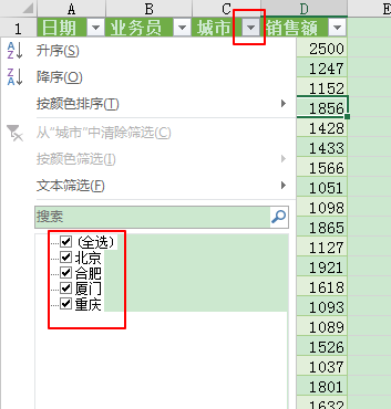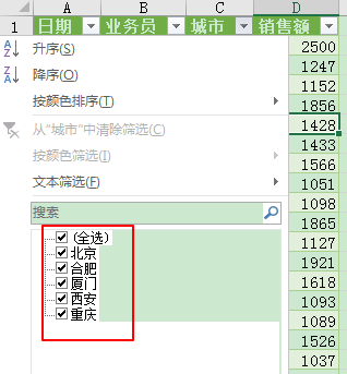 当点击“城市”这一列的筛选按钮,可以看到四个工作簿里的数据都在表里。