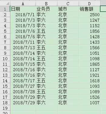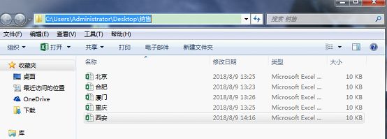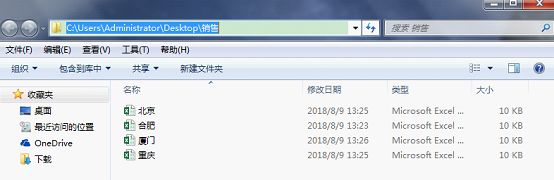 为了方便讲解,我们把原本的百来张销售明细表,缩略为下面4张表。如下图,在桌面“销售”文件夹里放有四个地区的销售数据。每个工作簿里的标题名都是一致的,顺序可以不一样。每个工作簿里城市这一列的值就是工作簿的名称,方便后续看合并效果。