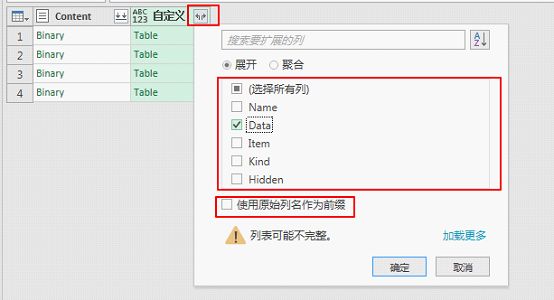 “Data”这一列显示的就是Table格式的表格,包含了表格里的数据,这里我们只需要提取这一列就可以了。点击自定义列右上方扩展按钮,选择扩展列“Data”,不要勾选“使用原始列名作为前缀”。