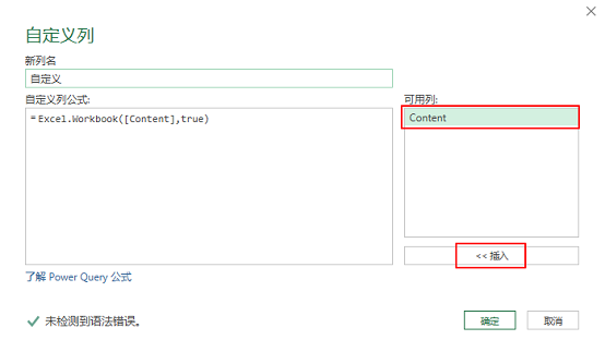 =Excel.Workbook([Content],true),公式中的“[Content]”可以点击右侧可用列里的“Content”,再点击右下角插入即可(注意:公式的大小写千万不能错)。