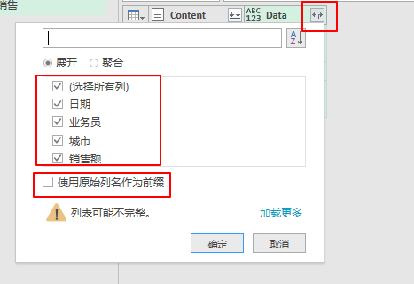 同样点击自定义列右上方扩展按钮,选择扩展所有列,不要勾选“使用原始列名作为前缀”。