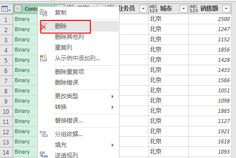 Binary作为二进制文件是无法在表格显示的,那我们要做的就是把它变成table格式然后把数据展开到表里。先把其他不需要的列删除。