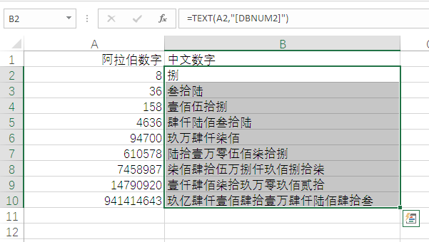 DBNUM2是针对于数字的特定代码,需要放在一对中括号中。数字2还可以改成1和3,具体是什么效果你可以试试看,记得留言告诉大家你测试的结果哦!