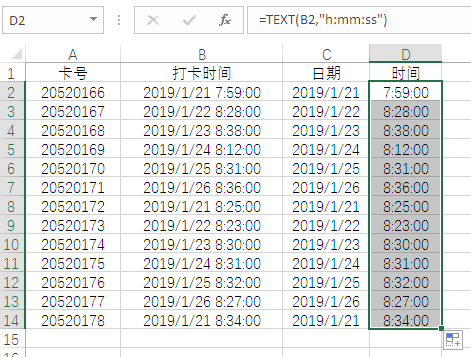 只有把打卡日期和时间分开才好做进一步的统计,TEXT真的可以办到吗?