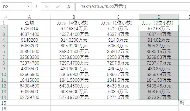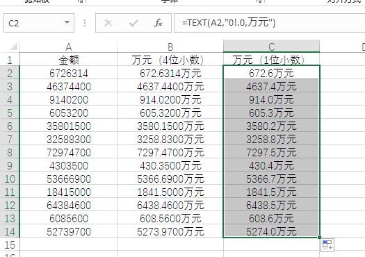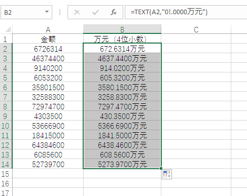 和第一个例子一样,0还是占位符,不过这里多了一个感叹号。如果没有感叹号,"0.0000"表示数字保留四位小数。在TEXT的秘密武器中,感叹号用于在原有内容的某个位置强制增加感叹号后的字符,所以我们在单元格中看到的那个小数点其实是在原数据千位数字左边强行加进去的,最后加上“万元”这个后缀,就变成这样的效果了。