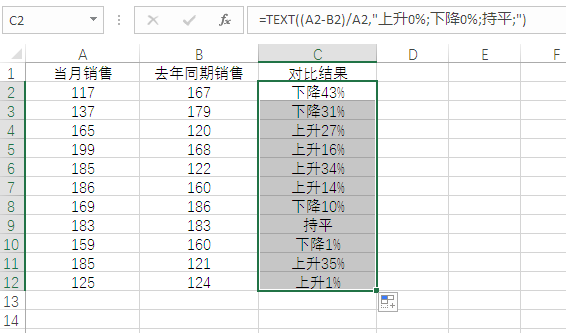 =TEXT((A2-B2)/A2,"上升0%;下降0%;持平;")