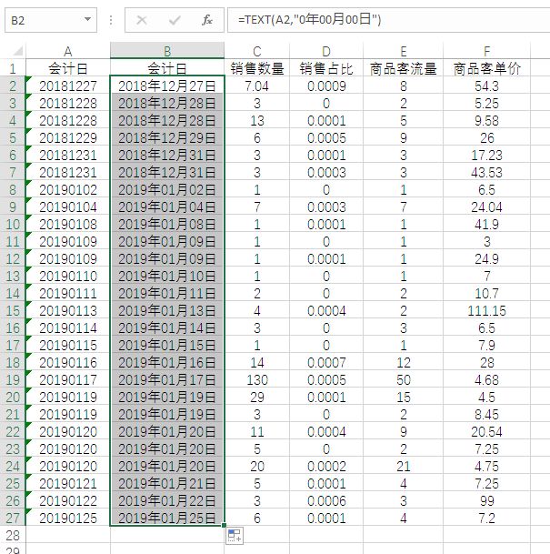 使用这样的日期去做数据分析是不便的,需要将其变成标准的日期格式才行,请看TEXT的表演: