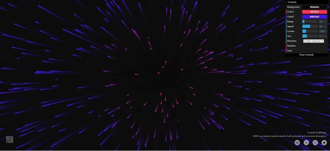 打开网站就是整个生成界面,右上角的控制项是英文的,可以更换背景色和射线的颜色,还可以更改范围,速度,数量和尺寸以及方向,也可以随机生成。保存时只需右击就可以保存了。