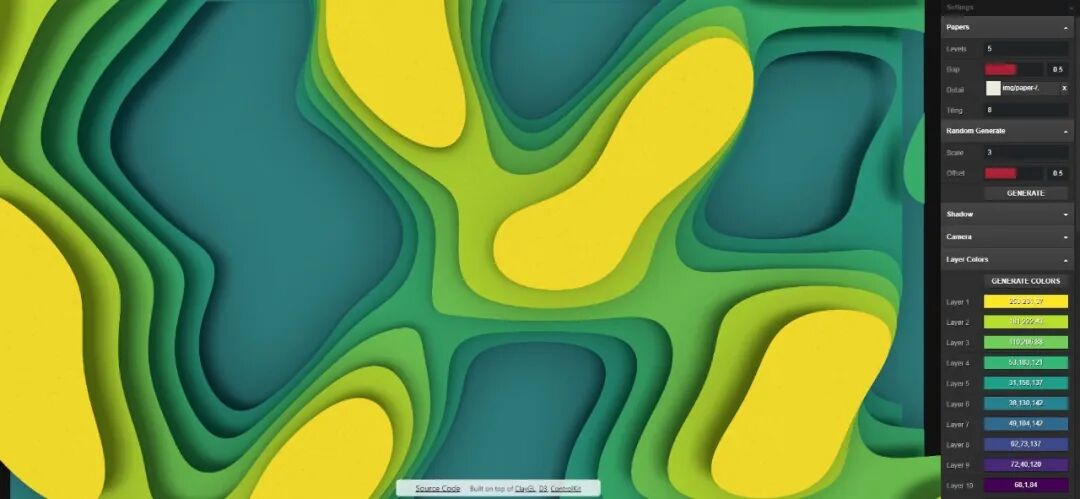 网站右侧可以调整剪纸的层数、每层的颜色和图片投影等参数,并且可以点击随机生成,随机生成的配色也很漂亮,看到喜欢的单击鼠标右键另存为图片即可~