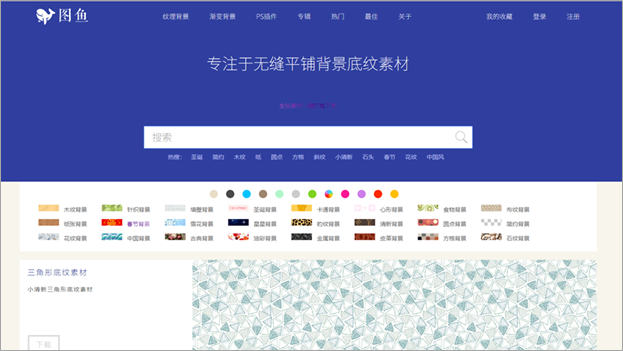 图鱼网站的设计很简洁,你可以直接在搜索栏搜索想要的纹理背景,也可以从搜索栏下方分类好的专辑找。图片质量高,风格也很多,而且是免费下载的哦~