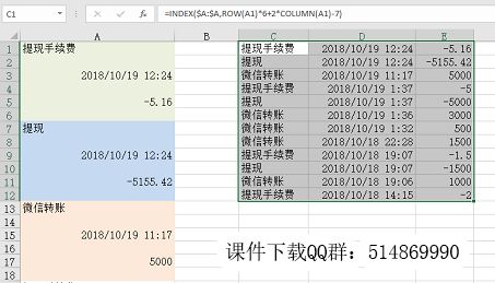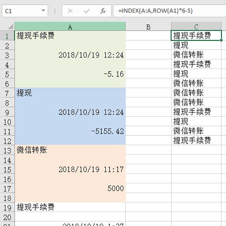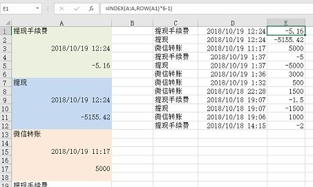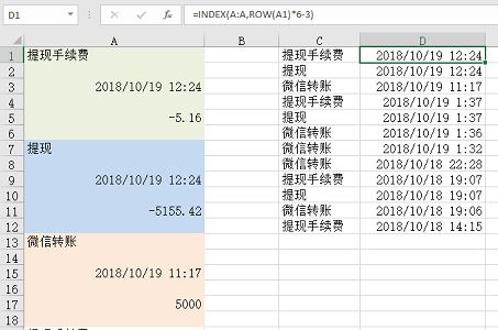INDEX(数据区域,数据所在的行),按指定行从指定区域中提取数据。这里要提取的数据是交易类型,其数据分别位于A列的1、7、13等行,使用ROW(A1)*6-5可以得到对应的行号。把ROW(A1)*6-5作为INDEX函数的第2参数就有了第一个公式。