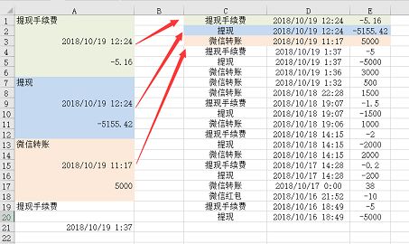 A列是网络上导出的原始数据,现需要整理成C、D、E列的形式。为了便于理解,这里用颜色对前三组数据进行了标注。