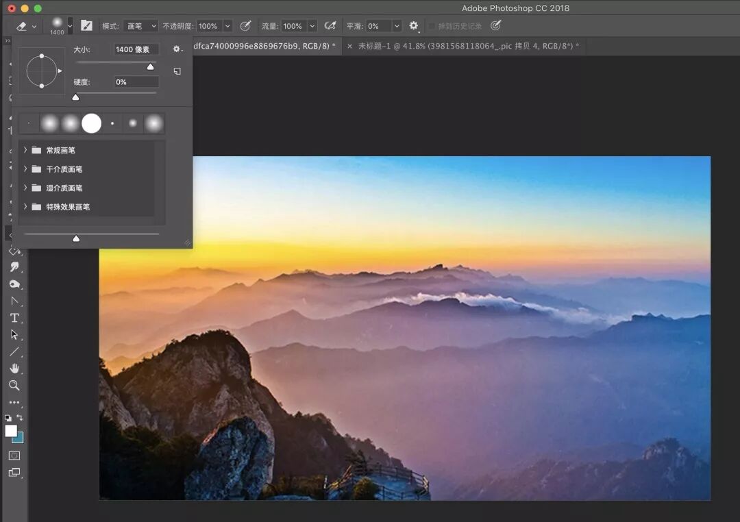 我们从网上搜索一张适合的图片,比如这里我们挑选了一张山景图,将它拖进PS,然后按 E 切换到橡皮擦工具,把橡皮擦硬度设置为 0 :