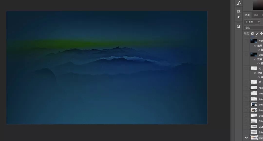 我们想要的是山景中间的重峰形状,于是把其它部分擦擦擦,橡皮擦硬度设为0之后擦出来的边缘就是半透明渐变,成这样: