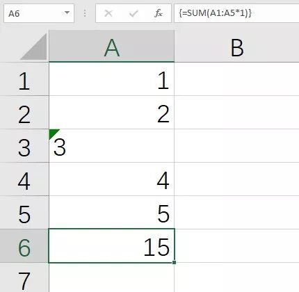 不过,对文本数字进行运算也不是不可以。我们先把文本数字进行加减乘除变成数字,然后再求和。比如把每个文本数字都乘以1,再把它们的积相加就得到文本数字的和。这个过程实际是数组运算。我们在单元格A6中输入公式“=SUM(A1:A5*1)”,然后按CTRL+SHIFT+ENTER三键结束。可以发现公式外面被套上了一个大括号,这个大括号表示数组运算。直接输入大括号是无效的,只能通过三键输入。如图9所示。