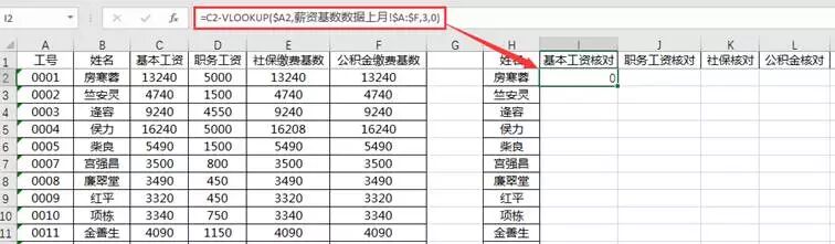 =C2-VLOOKUP($A2,薪资基础数据上月!$A:$F,3,0)