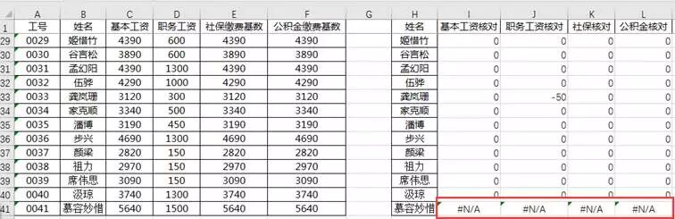如果出现#N/A情况,说明在上月数据表中没有查到该员工的数据,代表着该员工为本月新员工。