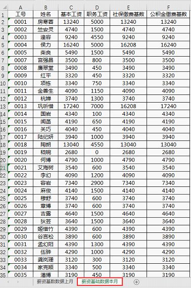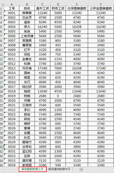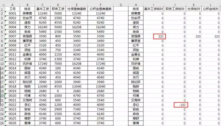 我们需要同时核对基本工资、职务工资、社保、公积金上月和本月数据变化的情况。