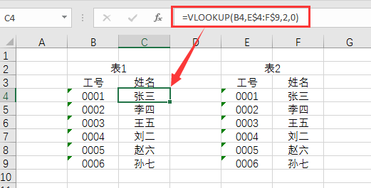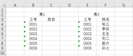 有两张表,表一只有工号没有姓名,而表二完整的,既包含工号也包含姓名。我们想要利用表二的数据把表一的姓名列填好。换句话说就是在表二内查找工号,然后把工号对应的姓名返回到表一内。