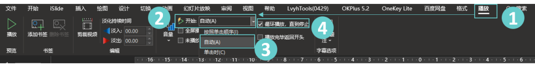 点击「播放」-开始选项中选择「自动」-视情况选择「循环播放,直到停止」
