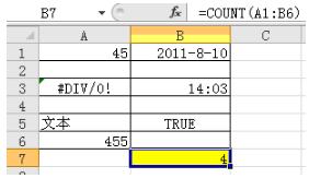 案例:A1:B6区域,用COUNT函数统计出的数字单元格个数为4。日期和时间属于特殊的数字序列。