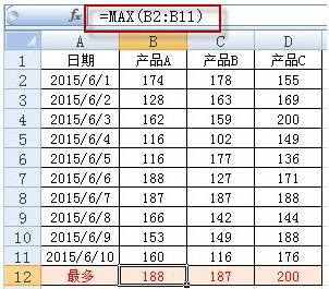 在B12单元格输入公式:=MAX(B2:B11),然后向右拖动复制得到产品B和产品C的最大产量。前面我们说了excel取最大值函数有MAX函数和LARGE函数,那么LARGE函数一样可以做到,公式为=LARGE(B2:B11,1)。