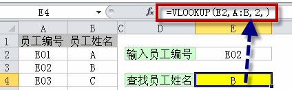 E4单元格输入公式:=VLOOKUP(E2,A:B,2,)