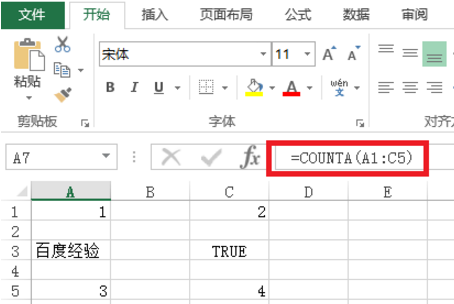 输入公式=COUNTA(A1:C5),返回6,也就是6个单元格有内容。