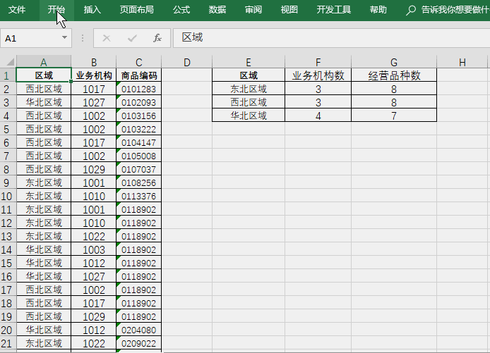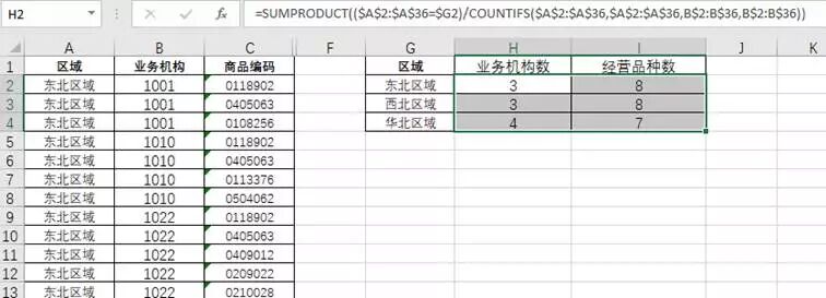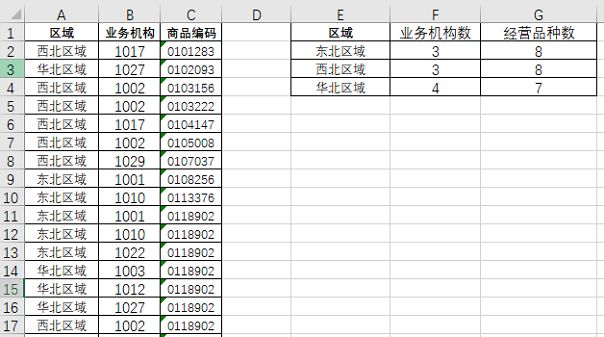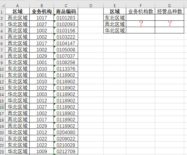 某公司在全国有三大市场片区,分别是西北、华北、东北。每个片区设置了多个业务机构负责具体经营。下表左边三列是区域、机构代码、商品编码等数据(这里只是截取了少部分),现在需要统计每个区域下面的业务机构和经营品种数。