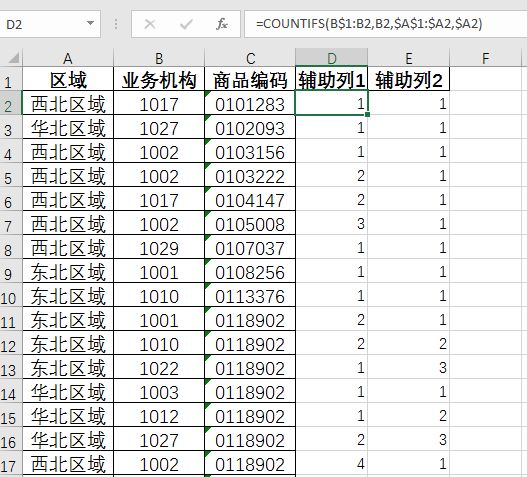 以第一个辅助列来说明公式的作用。公式的结果就是依次标注同一区域同一业务机构是第几次出现。
