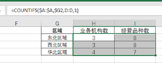 这个公式要比辅助列那里好理解的多。譬如H2单元格中的公式就是统计A列和D列中并排出现“东北区域”和“1”的次数。
