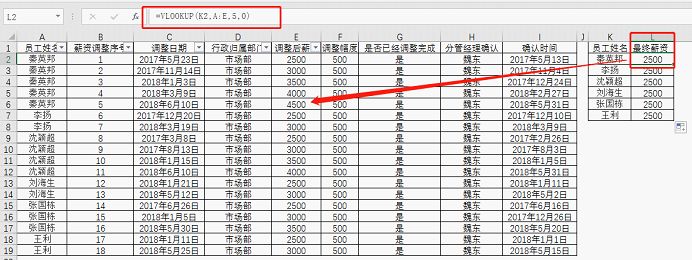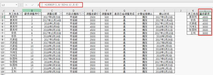 如上表通过函数公式VLOOKUP(K2,A:E,5,0)查找秦英邦对应薪资调整记录,返回的是第一次调整后的薪资。现在需求返回员工最终的薪资,也就是表中的E6单元格。