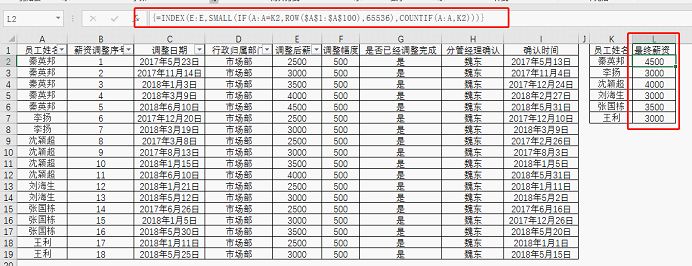 INDEX函数通过行数来返回对应单元格的数值,INDEX(E:E,6)就表示返回E列中第6行的数值。所以上方的公式中,第二参数使用了SMALL函数来得到同一个人最后一次工资调整的行号。